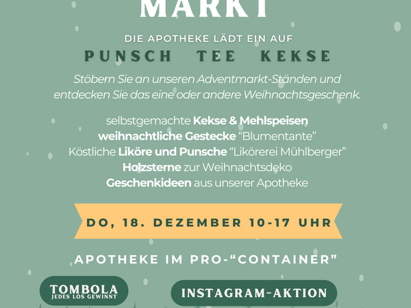Die Apotheke lädt ein auf Punsch & Kekse. Kommen Sie vorbei, wir haben viele Highlights für Sie vorbereitet. Tombola - Jedes Los gewinnt! Große Verlosung - mit einem Hauptgewinn im Wert von über € 100,-. Weihachtliche Musik.